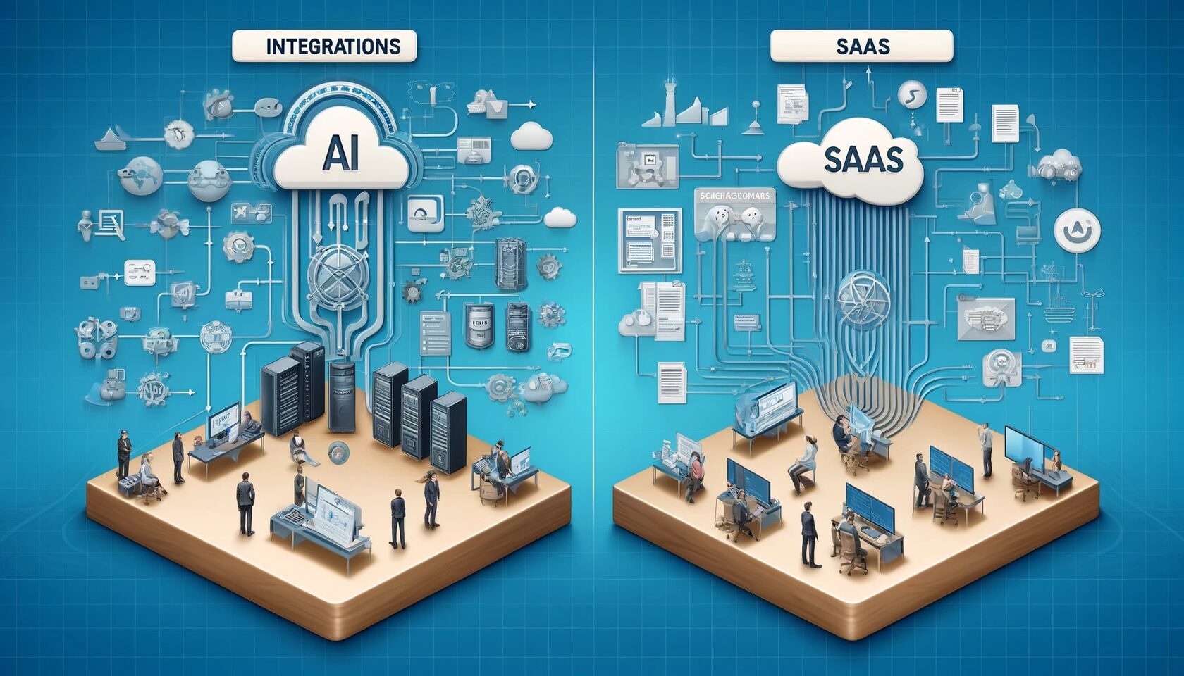 Внедрение искусственного интеллекта (ИИ) в бизнес становится все более актуальным в современном мире. Однако перед компаниями возникает вопрос: каким образом лучше всего осуществить это внедрение - через интеграции с существующими системами или с помощью облачных сервисов SaaS? Давайте разберемся.